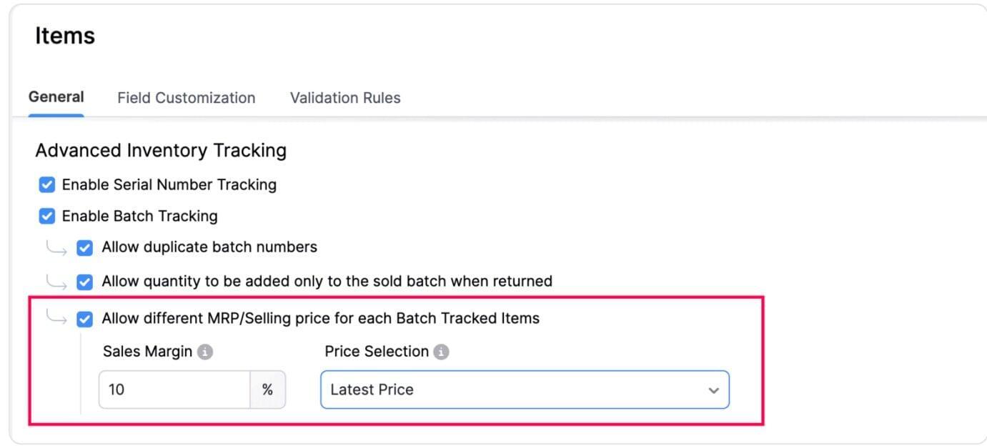 Set different selling prices for batch-tracked items. The system picks the right batch price per transaction and auto-splits line items when needed.