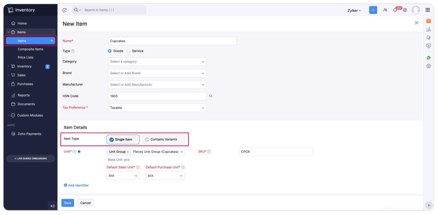 Create items and their variants from a single unified page. Choose between a single item or one with variants — define attributes and generate all combinations instantly.
