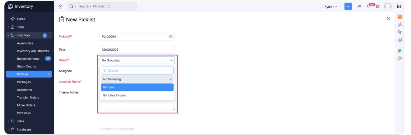 Streamline picking operations with flexible grouping options — assign picklists by item or by sales order, with different assignees for each group.
